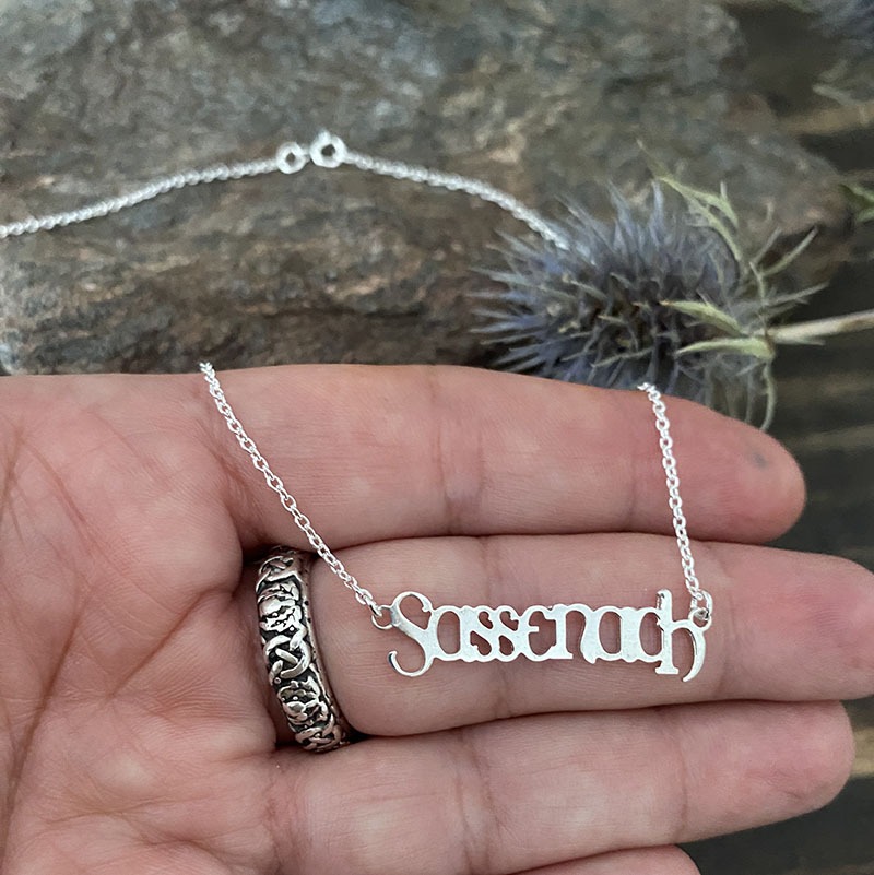 Gargantilla de plata entrepieza realizada a mano y con la palabra Sassenach, quizá la primera palabra que aprendemos en la serie Outlander. Deriva del gaélico sasunnach.
