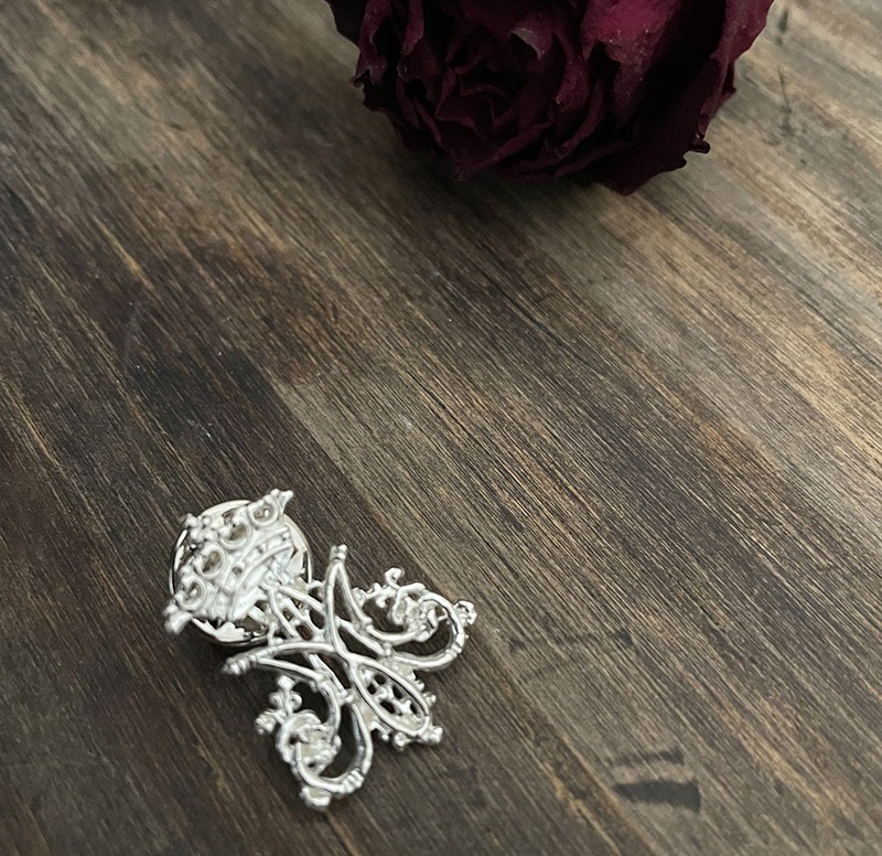 Gemelos realizados a mano en plata con la M de María Amantísima y corona. En la foto aparece la del pin, que sería igual a los gemelos.